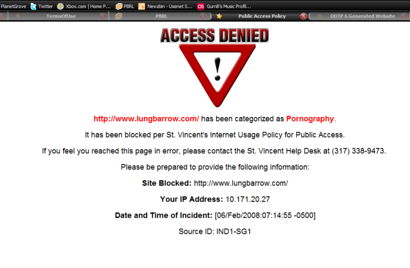 I will assume this means somebody intentionally added me to their blacklist, and I’m still trying to figure out what from my site would be offensive to someone who works at a hospital. I mean, come on, this is a place where they remove organs from people and allow the elderly to prance around the halls in hospital gowns that leave nothing to the imagination. Trust me. I used to work in a hospital. I’ve seen stuff that will give you nightmares.