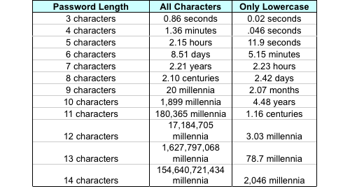 Assuming the hacker has a reasonably fast connection and PC here is an estimate of the amount of time it would take to generate every possible combination of passwords for a given number of characters. After generating the list it’s just a matter of time before the computer runs through all the possibilities – or gets shut down trying.