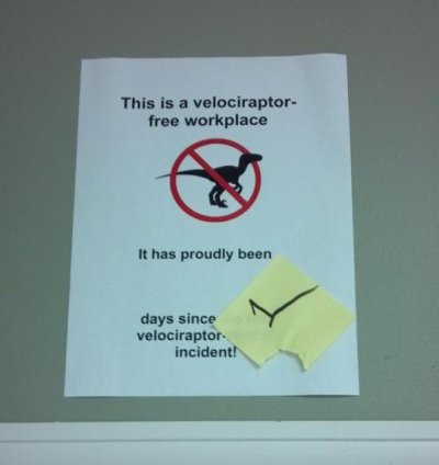 This hangs above the door in the developer’s bay. Seems like every couple of days it gets reset back to “1.” I haven’t confirmed this yet, but it has suddenly dawned on me: I think I am the velociraptor.