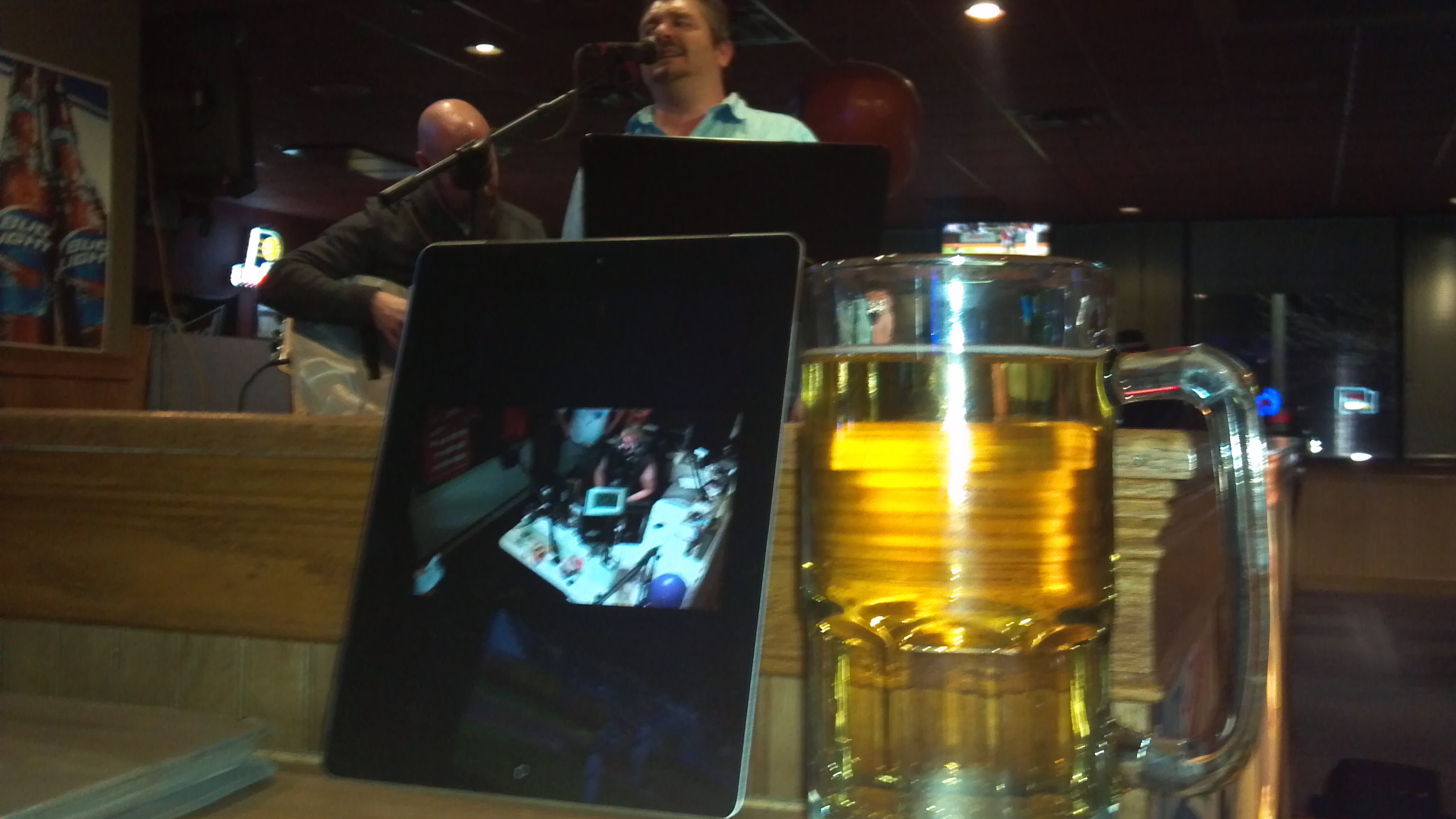 By the last night, you could tell 65 hours of sleeplessness was taking its toll. Fortunately, what was 2AM over there was barely the start of the weekly open mic over here. Once now “International Superstar Jack Barkley” and I got the gang caught up as to what was going on, we pulled the SineFM webcam up on an iPad and spent the evening passing it around the bar, taking pictures of it, and Tweeting them across the pond one every few songs — just so good ol’ Mark and Simon knew people actually were awake and rooting for them. We even videoed a song-dedication and posted it to Facebook for the guys, though that got butchered and finally showed up three hours later with the sound out of synch. We did get a little sporadic banter going, but obviously the guys were kinda busy over there, and 140 characters is hardly a conversation medium. In the end, we cleared up a few misconceptions about things, like “cockles” versus “clams.” For example: in landlocked Indiana, clams are for sauces, chowder, or deep frying. Over there, clams are ubiquitous snacks that apparently get pickled, served with vinegar, or made into ice cream.