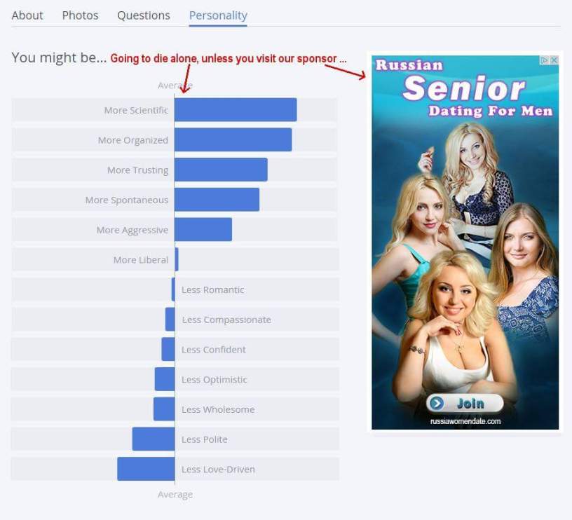 Actual screenshot of my online dating assessment, along with an ironic recommendation. My takeaway is that their algorithm thinks: