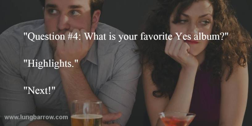 Okay, this one is exaggerated, but still based on a real conversation. I do try NOT to go overboard on my obsession with prog on the first date. It’s more of a “third date” thing when you’re trying to pick out music for the evening.