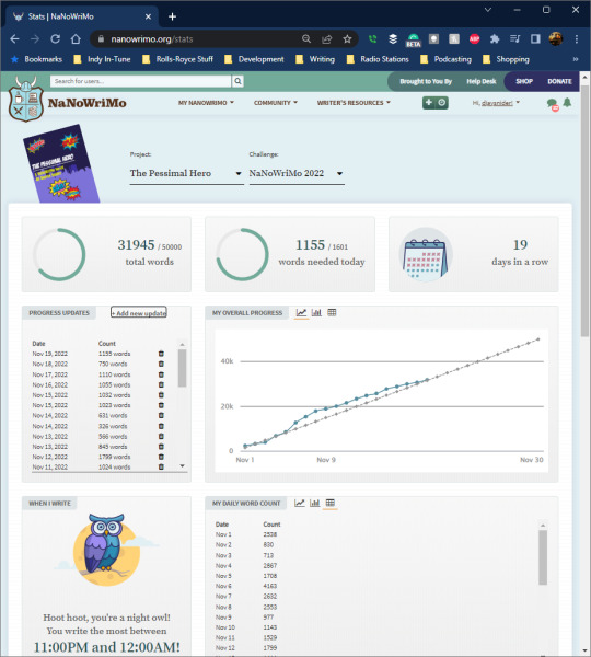 Lost my cushion of words and now running just a hair over par as we head into the last full week. I’m pretty confident though. We’re through the fluff I had to make up on the spot, which slowed me down, and now getting to the well-planned “All is Lost” and “Blackest Hour” beats. I got this.