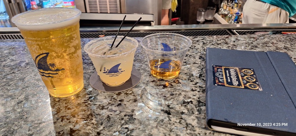 On the other hand, once I got the hang of the place, I found I really didn’t exactly hate it. First up. Wait a minute. Landshark Lager?! I love Landshark. I frequently buy that for the magic fridge in Studio B during the dog days of summer. That’s a fine Anheuser-Busch product right there. I had no idea it was the house beer at all Jimmy Buffett locations, but … okay … the guy has taste in beer. Add in margaritas priced like it’s 1977, plus the occasional friendly parrothead insisting on buying me one, and suddenly Buffett-world starts to look like an all-inclusive writer’s retreat.