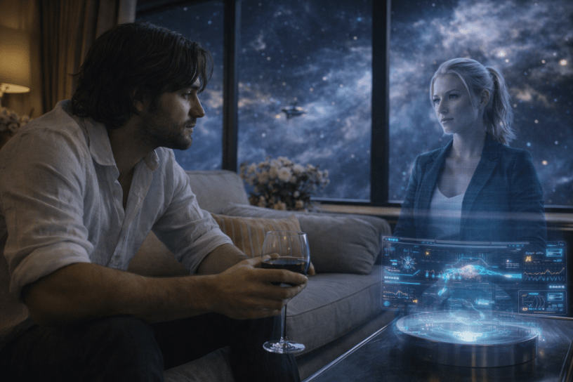 Satisfied, he grabbed his untouched glass of wine and opened the interface. The holo of a plain-looking woman materialized in the middle of the room. “Good evening, Dr. Katsaros. My name is Syn. Nina Leitner. How can I be of assistance this evening?”