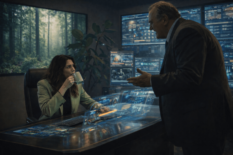 Once she had settled into her desk, Serah began to feel more at ease. The display of market data, news updates, and myriad projects swirling above her desk felt familiar and comfortable. The only marked difference was that a picture of a Scottish farmhouse now replaced the usual meadow painting on the holoprojector. Erik had kept any additional billys, sales inquiries, and unannounced callers at bay again, remarking that the onslaught had subsided considerably since the previous day.