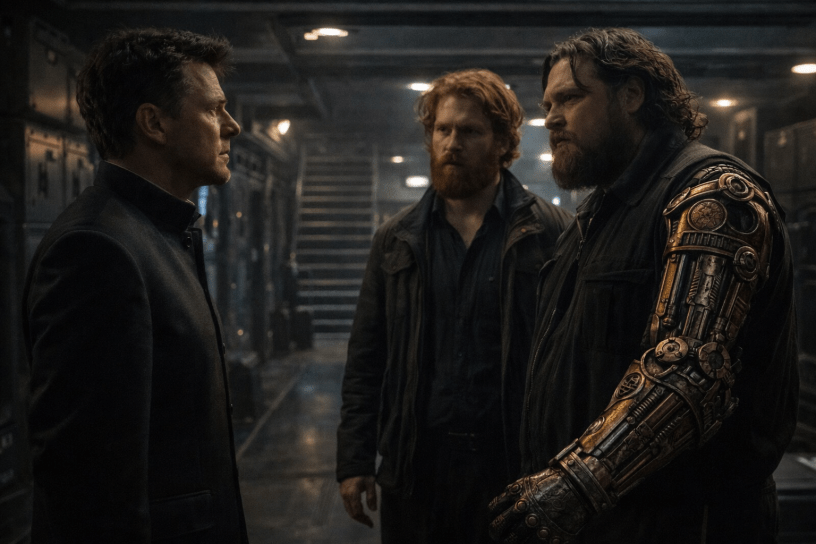Clay glanced. Two men in clean coveralls: one with dark red hair and a full beard; the other was heavyset, with longer hair and a cybernetic arm. “That arm’s out of place for a working-class costume. Nice brasswork inlays. Looks more antique than practical. Otherwise, they read normally.”