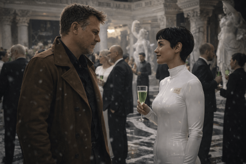 “You’re at the wrong party, aren’t you?” An attractive young woman dressed in a form-fitting white bodysuit sidled up to him, sipping at a mostly-empty glass. She regarded his brown jacket and raised one eyebrow flirtatiously.