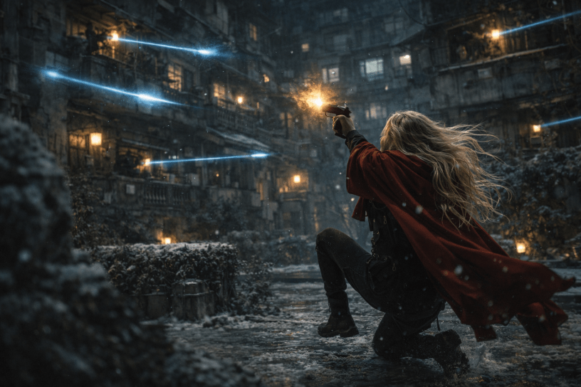 “Cover me, then break right,” Ursza said, throwing him the plasrifle and holding out her hand. Clay obliged by tossing her his smaller, handheld version. Without acknowledgment, she took off in a full sprint through the park with speed and balance that seemed almost impossible for a human. She was halfway across when the first two shots rang out from a balcony in the corner. Clay took cover in the doorway and answered with four shots from the rifle. Then, from the opposite corner, three shots came directly at him, striking the ground at his feet, boiling the snow with an angry hiss of steam.