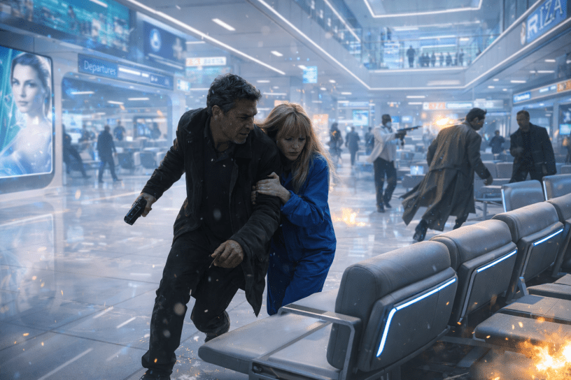 Once out of the main concourse, a squad of four guards ran toward them. “Female, black leather jacket and a male in a trenchcoat. They set off a bomb and are armed!” Seeing that he had no weapons of any kind on him, the guards ran past him and into the concourse. Clay helped Ursza to her feet and directed her straight for an exit door. They found themselves on a loading platform outside the terminal, mere meters from Ness’s waiting aircar.