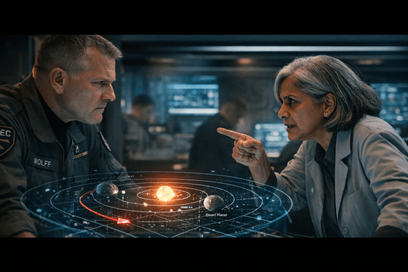Wolff entered the command module and sealed the door behind him. “Give me a tactical,” he barked at the duty officer who deftly worked a couple of controls until a holo appeared in the center of the room. It showed all the nearby dwarf planets with the LT-9 star and q-gate, located 200 million kilometers above the star, perpendicular to the ecliptic plane, to maintain a consistent distance to all points in the solar system throughout their orbits. Wolff gestured with his hands and zoomed in on the immediate neighborhood. It showed one craft, moving in an orbit parallel to their own, headed straight for them. “Any idea who the hell it is?” Wolff asked.