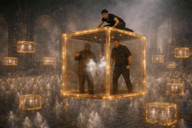 The seven entered a vast open area that seemed oddly larger than the building’s exterior suggested. To Jaysn it felt like being in a cathedral the size of a stadium. Cubes, roughly two meters on each side and colored in a dull gold-brown that emitted light without reflection, moved slowly through the room—some rising from the floor, some moving horizontally through the air, others hanging in a motionless cluster suspended above the ground. The floor was black with a bright white grid of light emanating from it. The grid’s size appeared to match the cubes that floated out of it.